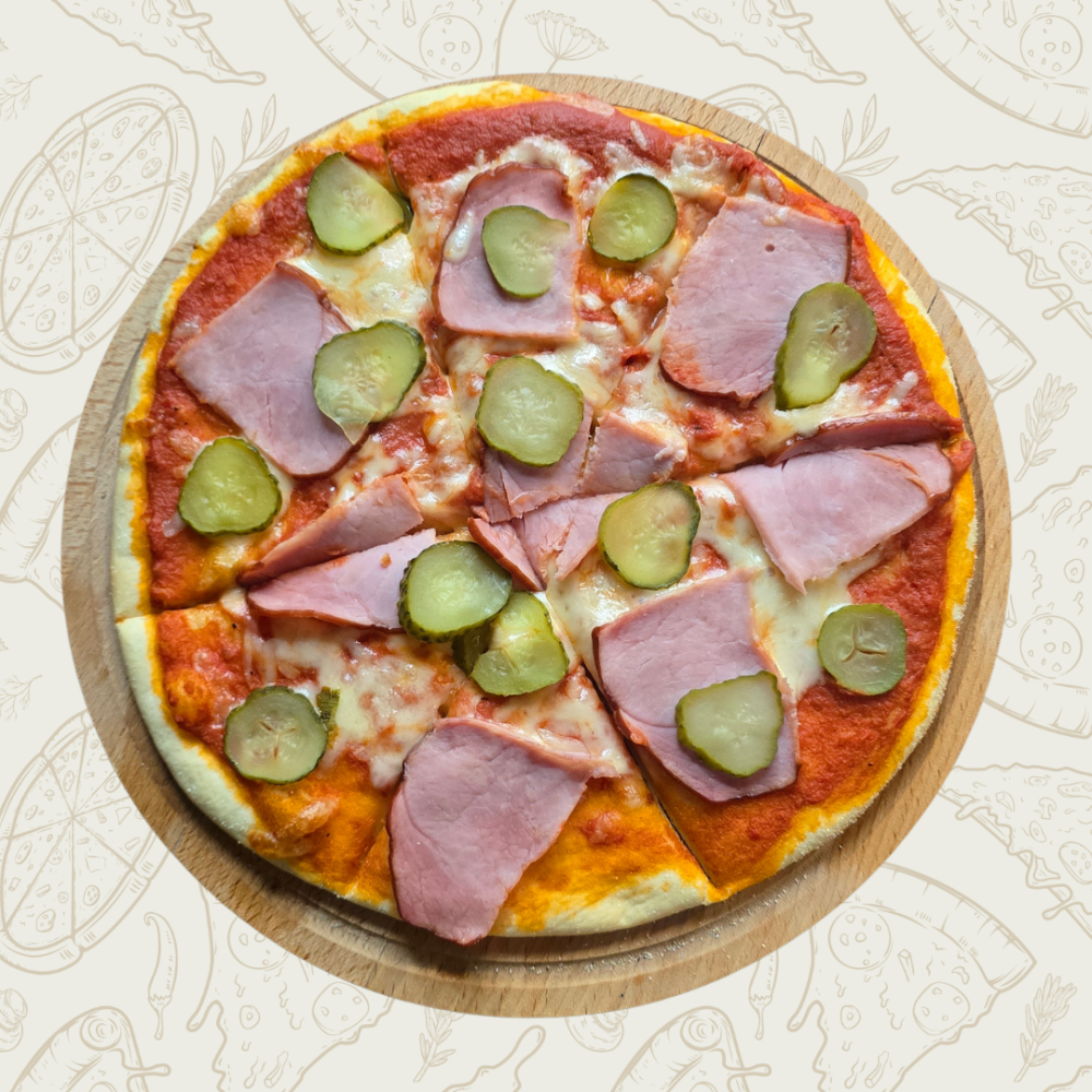 Томатная основа, моцарелла, ветчина, огурчики, чесночное масло.