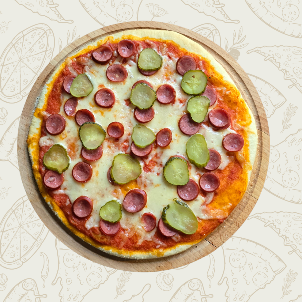 Охотничьи колбаски, маринованный огурчик, томатная паста, моцарелла
