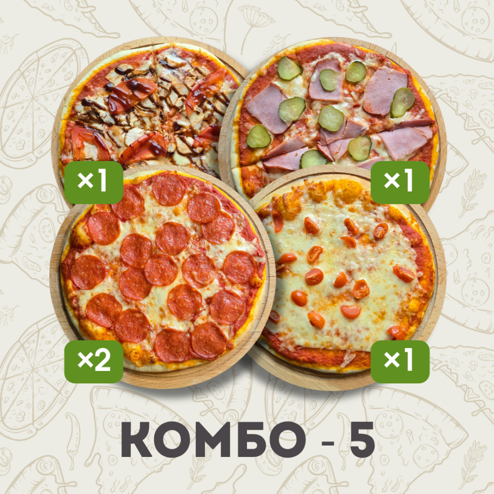 5 пицц: фирменная — 1 шт., ветчина — 1 шт., пепперони — 2 шт., сырная — 1 шт.