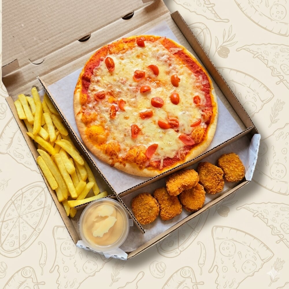 Пицца «Сырная» - 300 гр., наггетсы — 6 шт., картофель фри 100 гр., соус сырный.