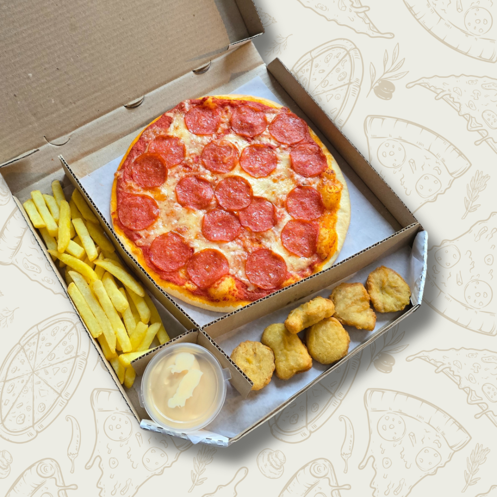 Пицца «Пепперони» - 300 гр., наггетсы — 6 шт., картофель фри 100 гр., соус сырный.